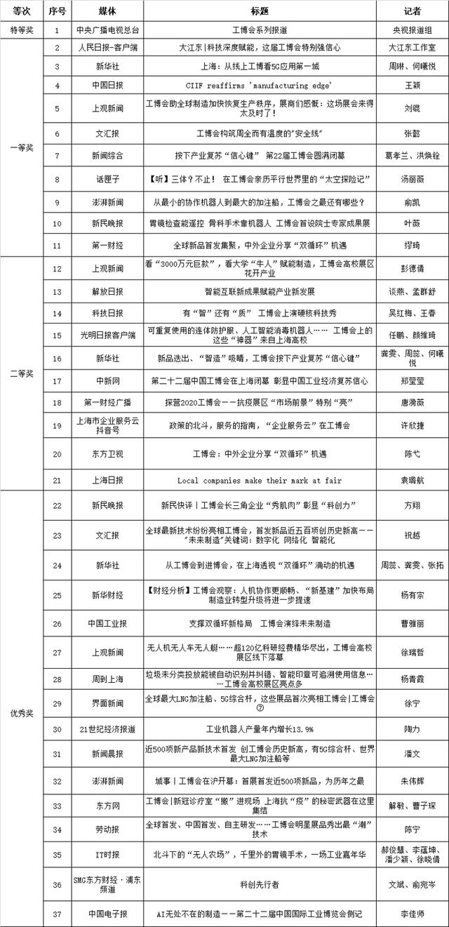 为了进一步扩大工博会的海内外影响力,吸引更多的展商及参观者参与到展会中,工博会鼓励海内外新闻媒体的广泛又有深度的报道,体现展会同媒体平台的互动交流,特设置“好新闻”评选活动,鼓励新闻媒介的参与。