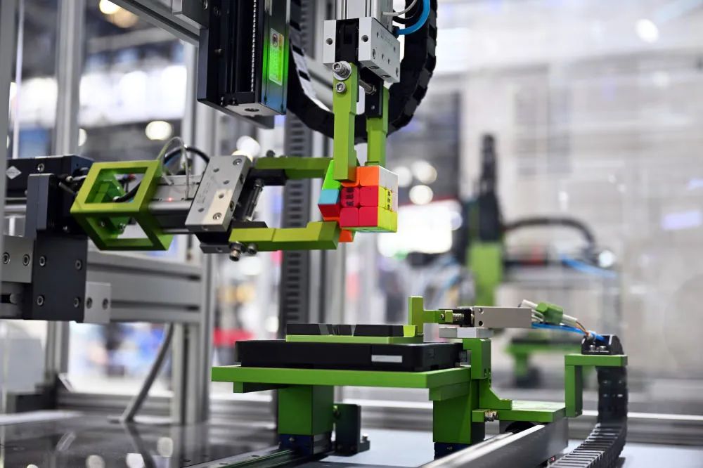 ——更快。在三菱电机展区,一款名为TOKUFASTbot的机器人装置,能以0.305秒的速度还原魔方,刷新了吉尼斯世界纪录,吸引了观众围观。展台工作人员介绍,新纪录创造的背后,有AI算法的加成,让设备快速完成对颜色的识别和还原路径的计算;此外还有机器人伺服系统的精准控制和快速响应。“这意味着,机器人可以在半导体、锂电等需要精准控制的领域高效完成生产。”