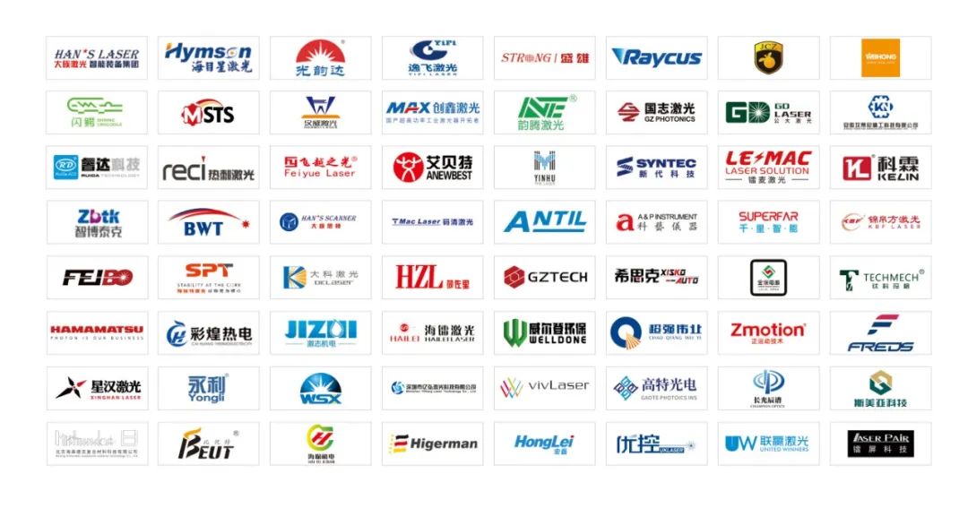 大族、海目星、光韵达、逸飞、联赢激光、天田、盛雄激光、大鹏激光、闪鳄、汉威、千钢激光、众力激光、华龙新力、锐科、金橙子、创鑫、韵腾激光、国志、公大激光、坎蒂尼、睿达、热刺、飞越、艾贝特、银湖、镭麦、科霖、智博泰克、新代、大族思特、重黎科技(科莱宝)、金海创、祥生、安特、科艺仪器、千里智能、飞博、斯派特、大科、荷佐里、国焱(光至)、威士登、希思克软嬴、金保电源、腾马、滨松、彩煌、激志、维宏、米纳、兴弘光电、海镭、威尔登、正运动、弗雷德斯、星汉、永利、万顺兴、凯普林、亿弘、活力、高特光电、长光辰普、优控、华英、精科、大族光子、泛宇、易智、东赢、超光科技、伊博特、兰特克、苗胜、峰质激光、四点零、润渊精密、超强伟业、海盟德、海瑜机电、海森德克、码清激光、众海、澳兰仕、盛镭、镭锳激光、欧斯普瑞、武汉睿芯、星耀激光等。