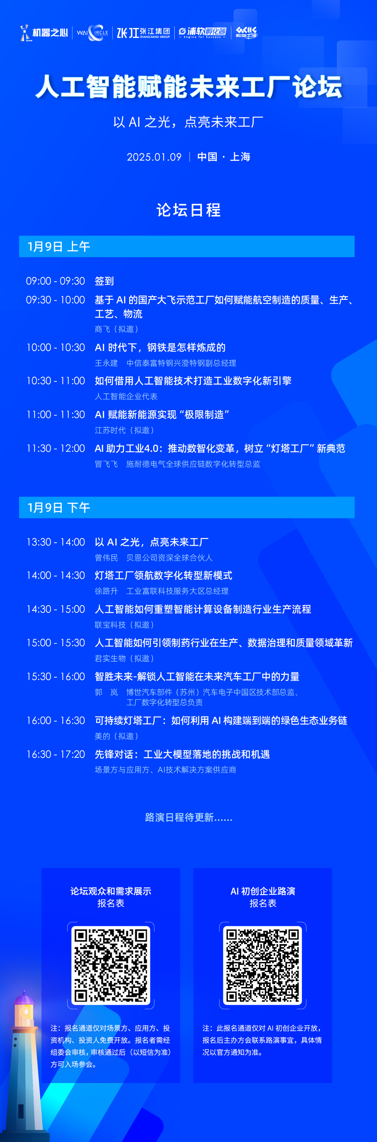 活动名称:以AI之光,点亮未来工厂——人工智能赋能未来工厂论坛 时 间:2025年1月9日,9:30-17:20 地 点:上海·浦东 报名截止:2025年1月6日